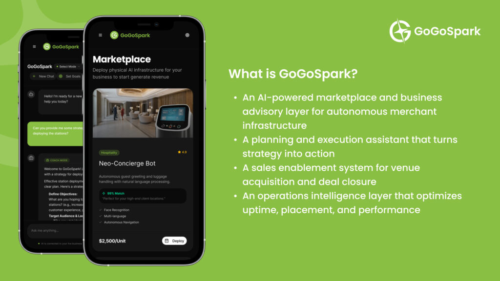 GoGoSpark functions as a 24/7 business assistant for ChargerGoGo operators—the entrepreneurs who invest in ChargerGoGo’s mobile charging kiosks, so they can earn income through phone battery rentals, DOOH advertising on the kiosks’ screens, sales and referrals. GoGoSpark combines sales training, data analysis, business consulting, technical support, financial guidance and operational coaching in a single, always-on platform. Based on feedback collected over a five-year period from thousands of ChargerGoGo’s operators, partners and small business owners across the country, GoGoSpark is intelligently designed to work alongside people, not replace them. The new platform equips operators to make better decisions, move faster and build sustainable income streams powered by sophisticated technology.